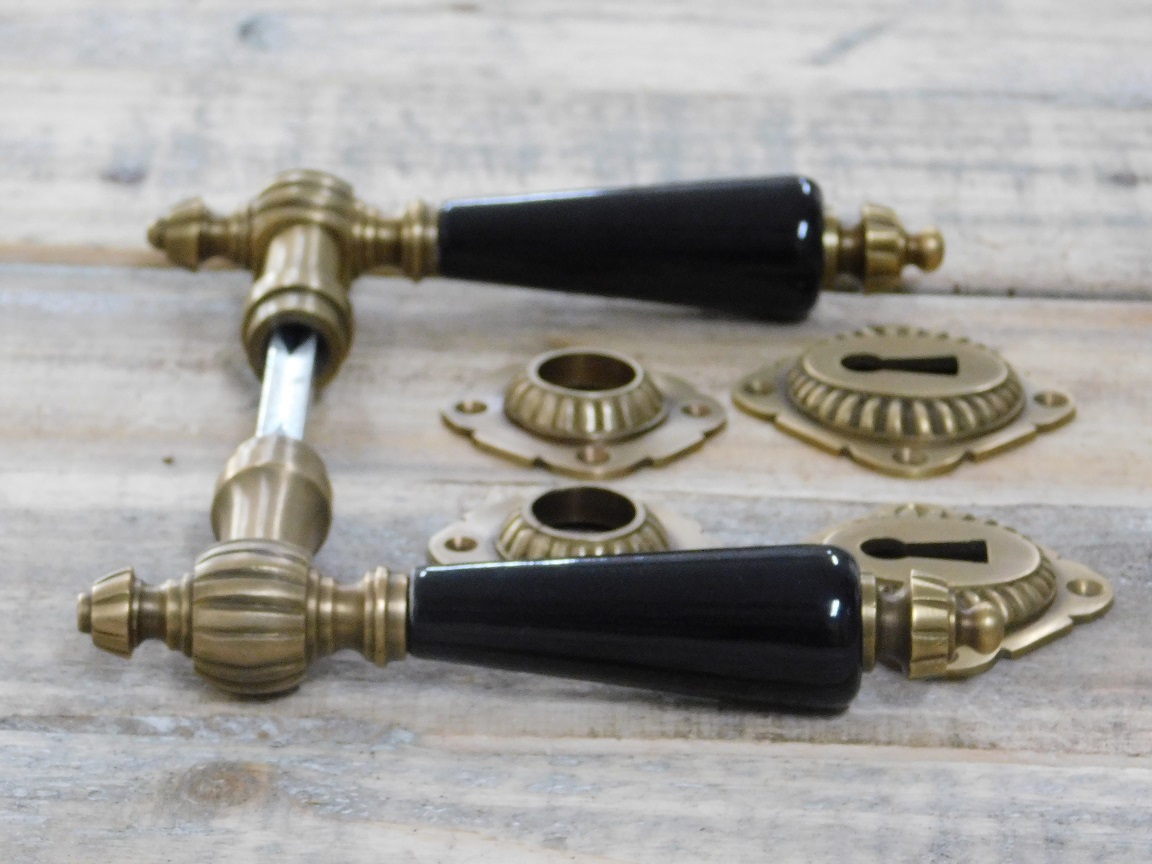 Set deurbeslag - gepatineerd messing met zwarte grepen van porselein - voor kamerdeuren