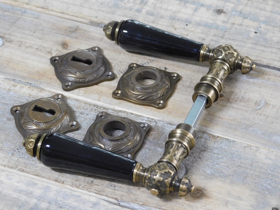 2 deurknoppen (handvat deep-zwart porselein) + 2 pushers rozetten + 2 sleutel rozetten, gepatineerd koperen