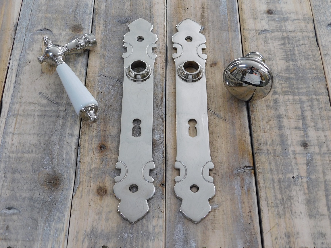 Een mooie cottage retro deurbeslag van gepolijst nikkel - bestaande uit mooie lange platen, een klink met fijn porseleinen handvat en een deurknop.