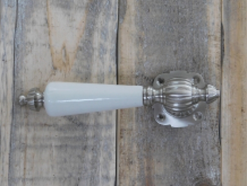 Prachtige klassieke set deurbeslag van geborsteld nikkel en voorzien van porseleinen grepen.