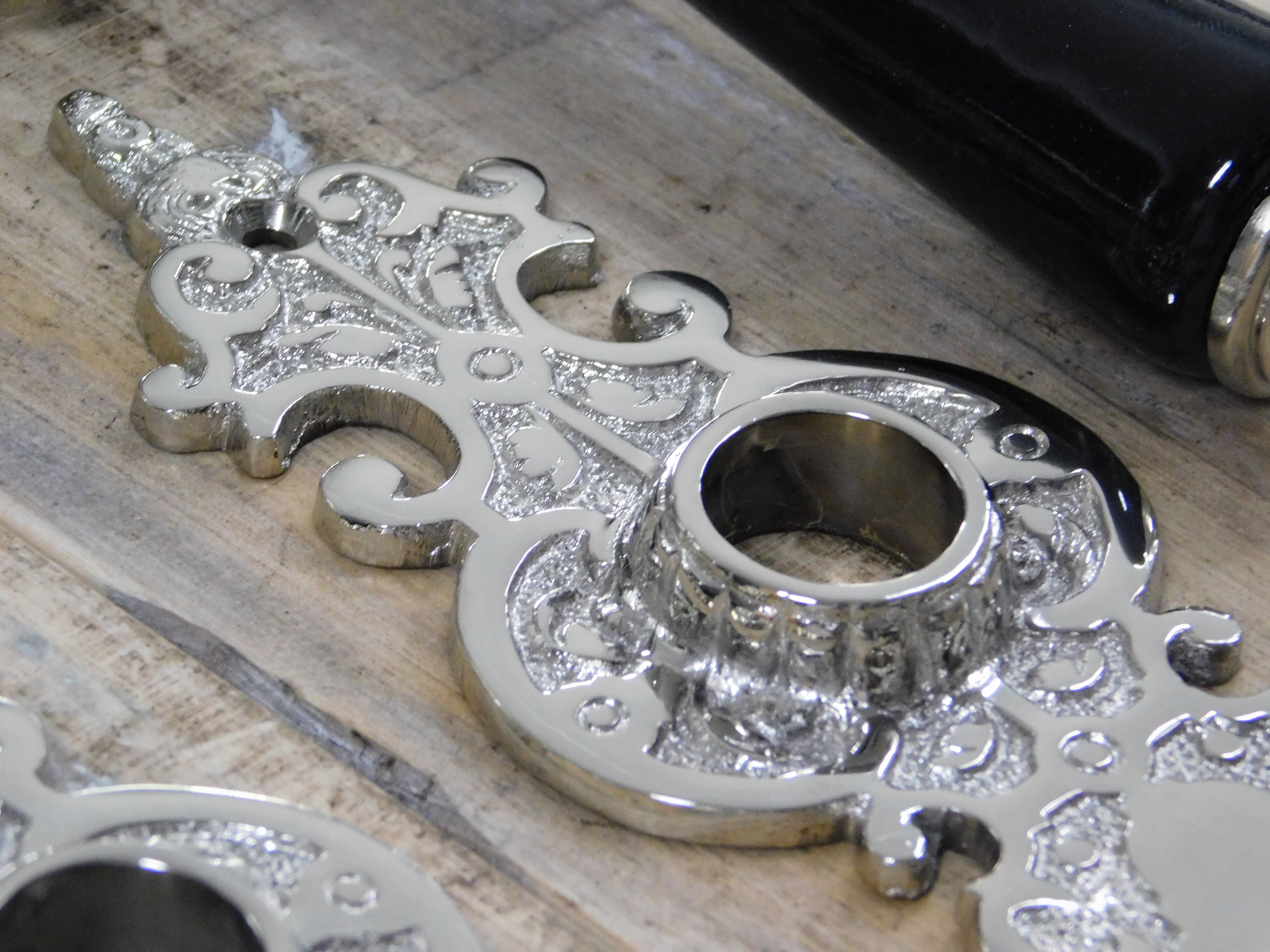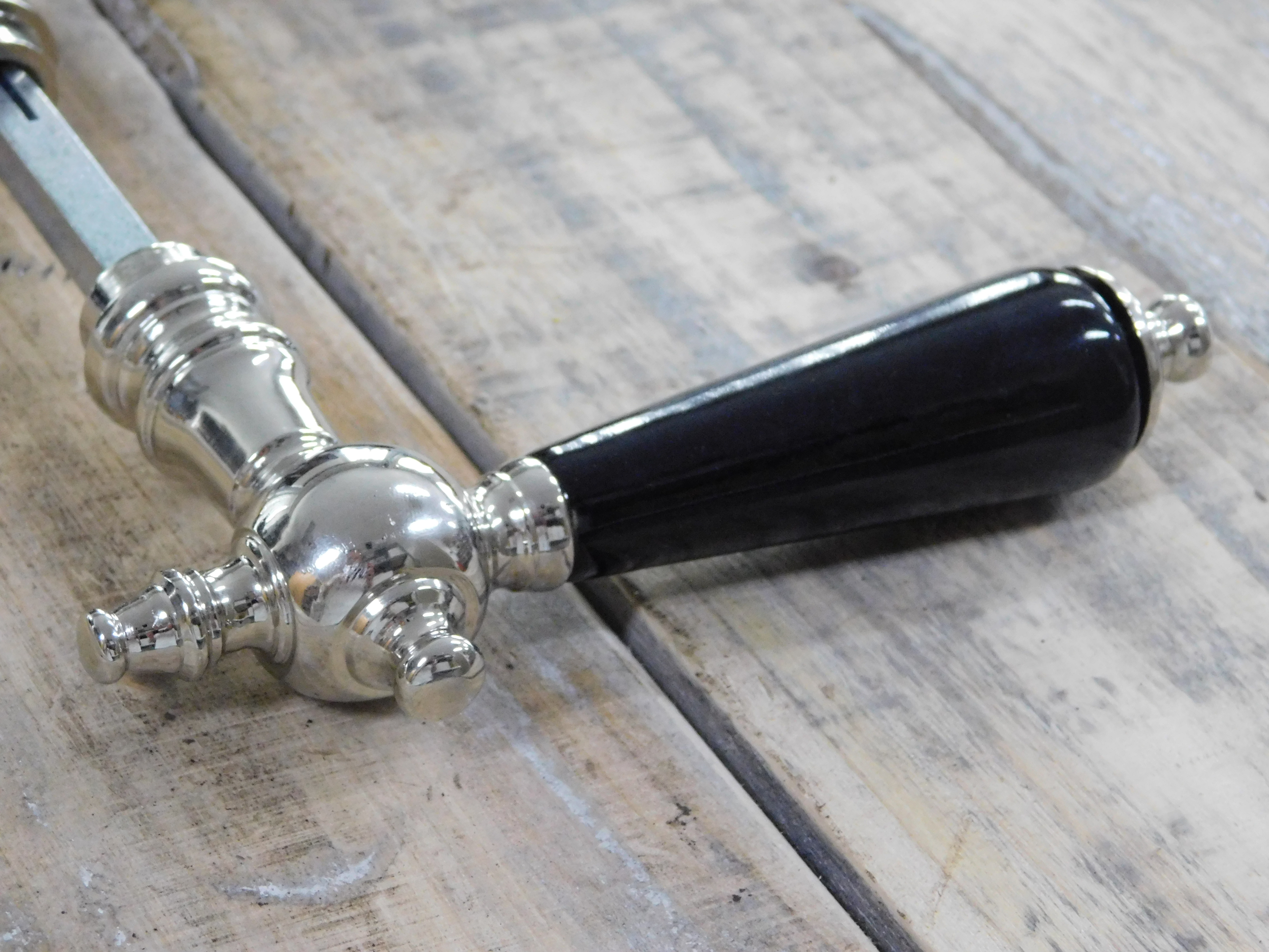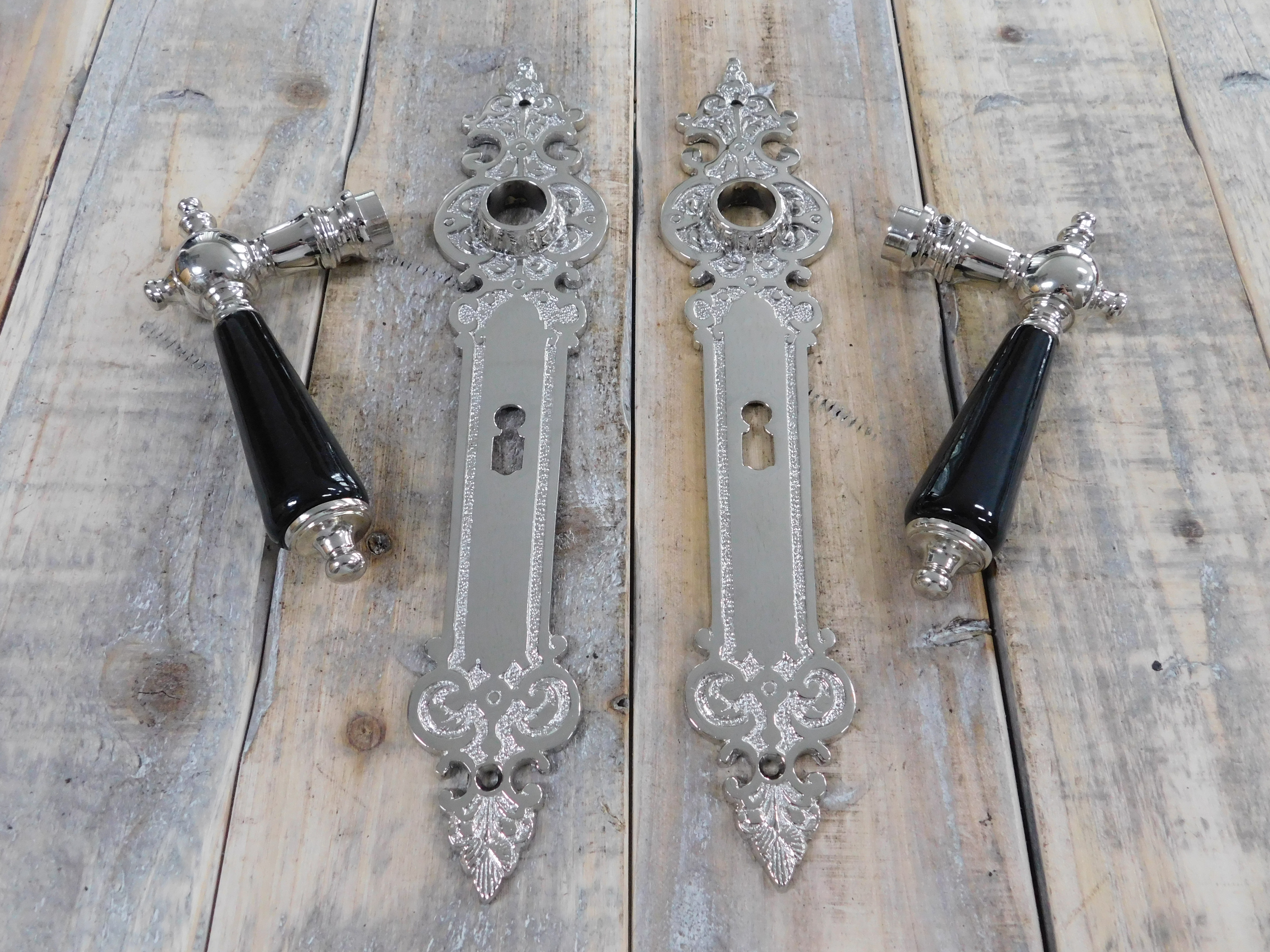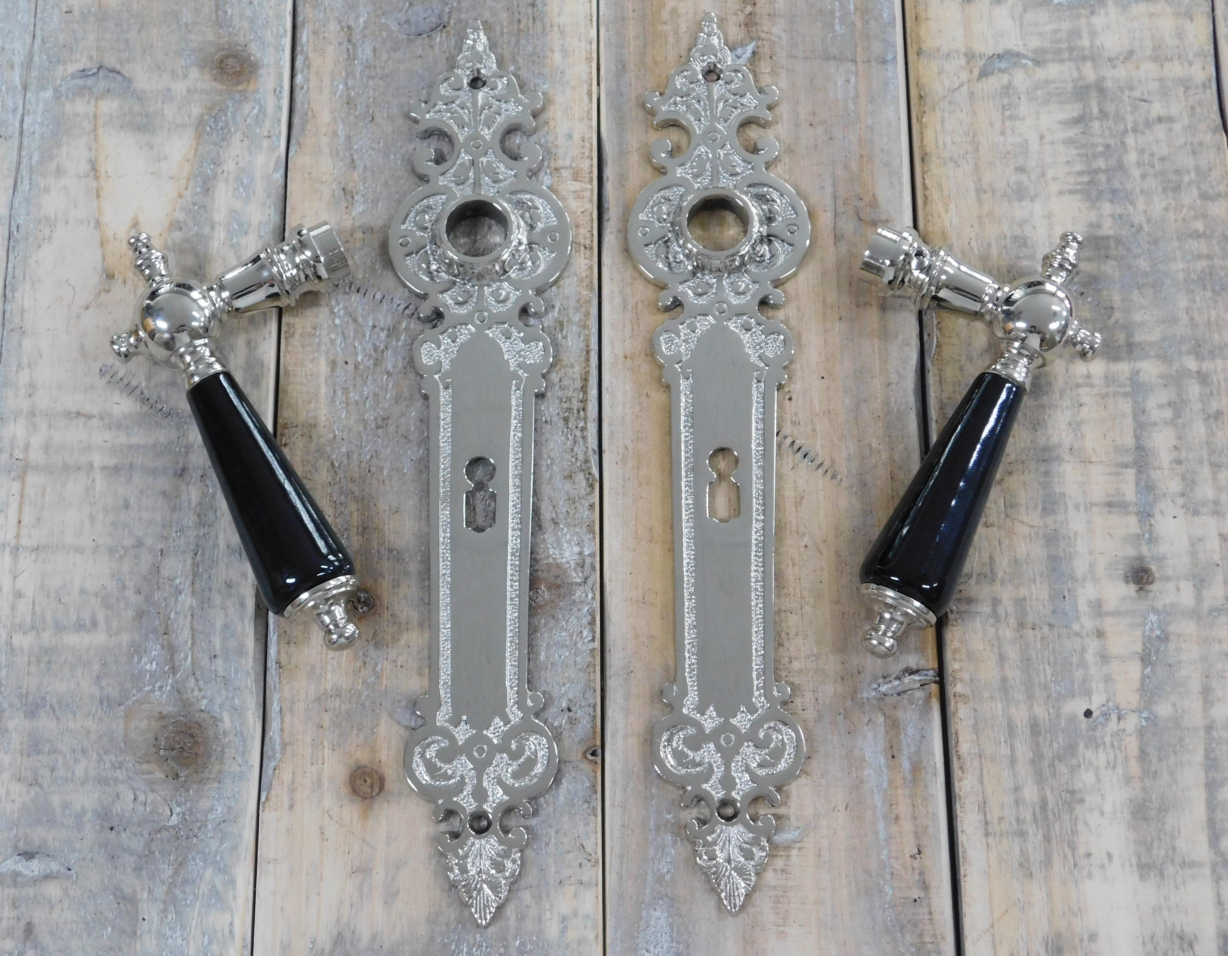 Een prachtige exclusieve set deurbeslag ''Tilspet'' met lange plaat van nikkel en een stijlvol handvat van zwart porselein.