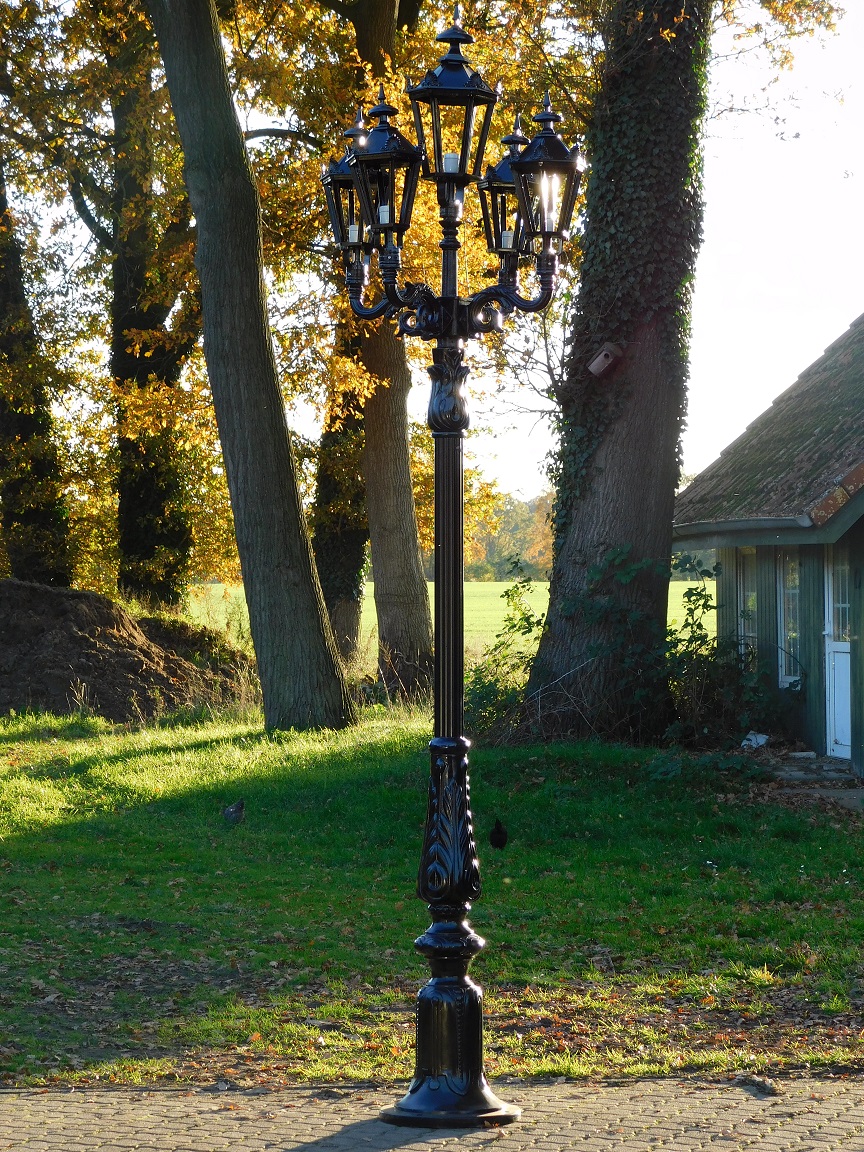 Geef je tuin, terras of oprit een exclusieve uitstraling met deze XL lantaarnpaal in het zwart, voorzien van vijf stijlvolle kappen.
