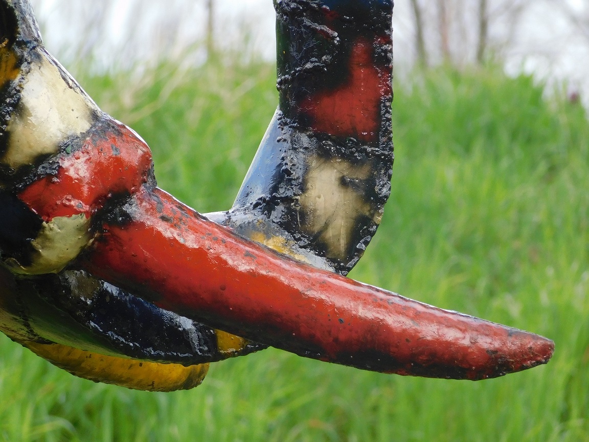 De zichtbare lasnaden en kleurrijke patronen geven het geheel een authentiek en ambachtelijk karakter.
