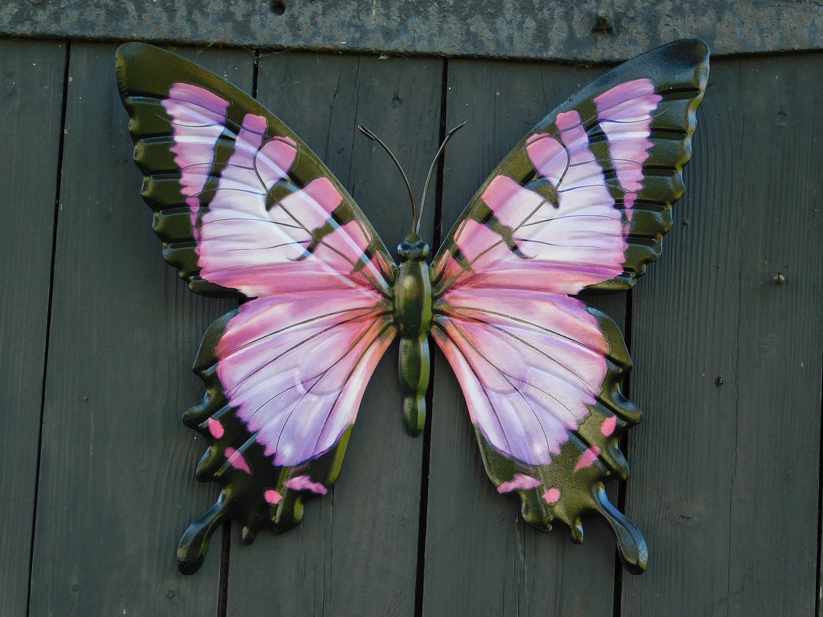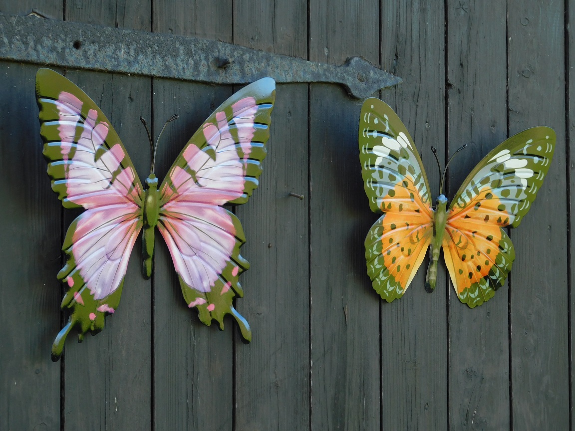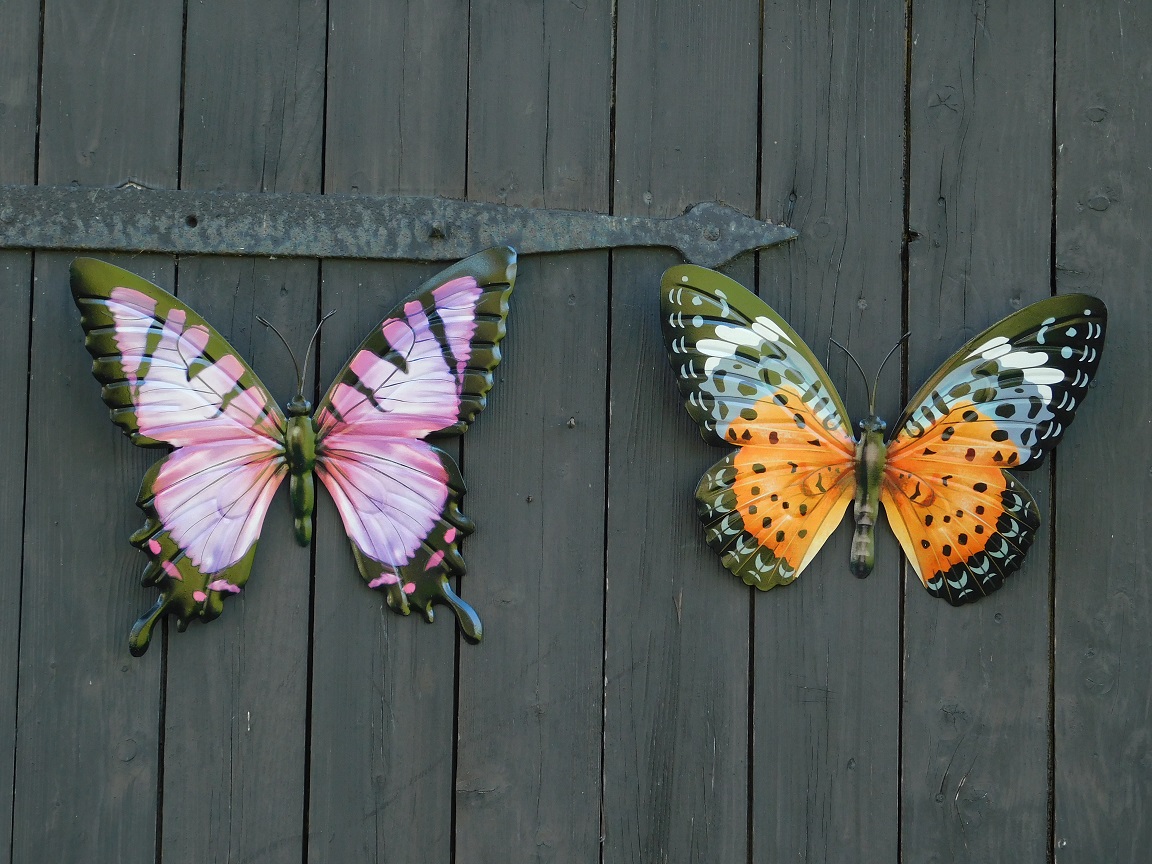 Das Set besteht aus einem orange-schwarzen Schmetterling (ca. 27 x 35 cm) und einem lila-schwarzen Schmetterling (ca. 32 x 35 cm).
