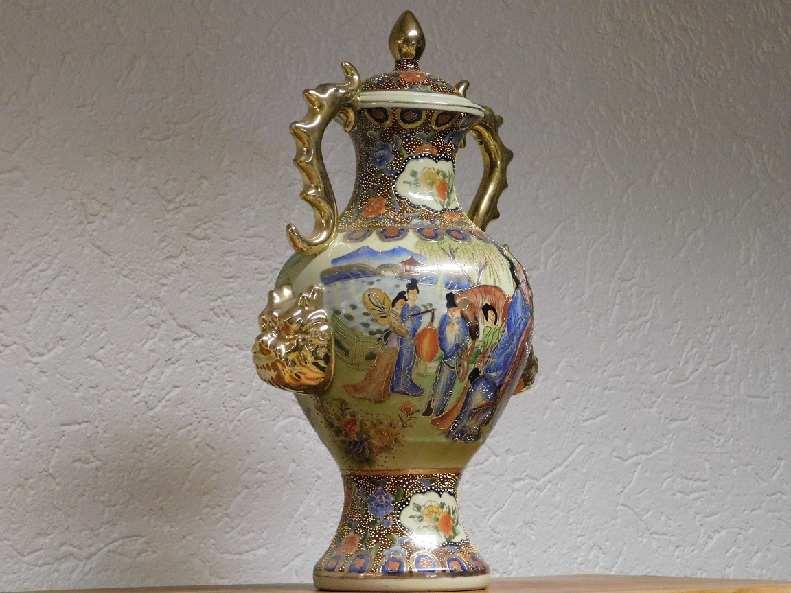 De gedetailleerde decoraties, rijke kleurtonen en fijne goudaccenten zijn kenmerkend voor de traditionele Satsuma-stijl.