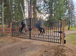 Wunderschönes schwarzes Schmiedeeisentor – 596 cm breit – mit sich aufbäumendem Pferd