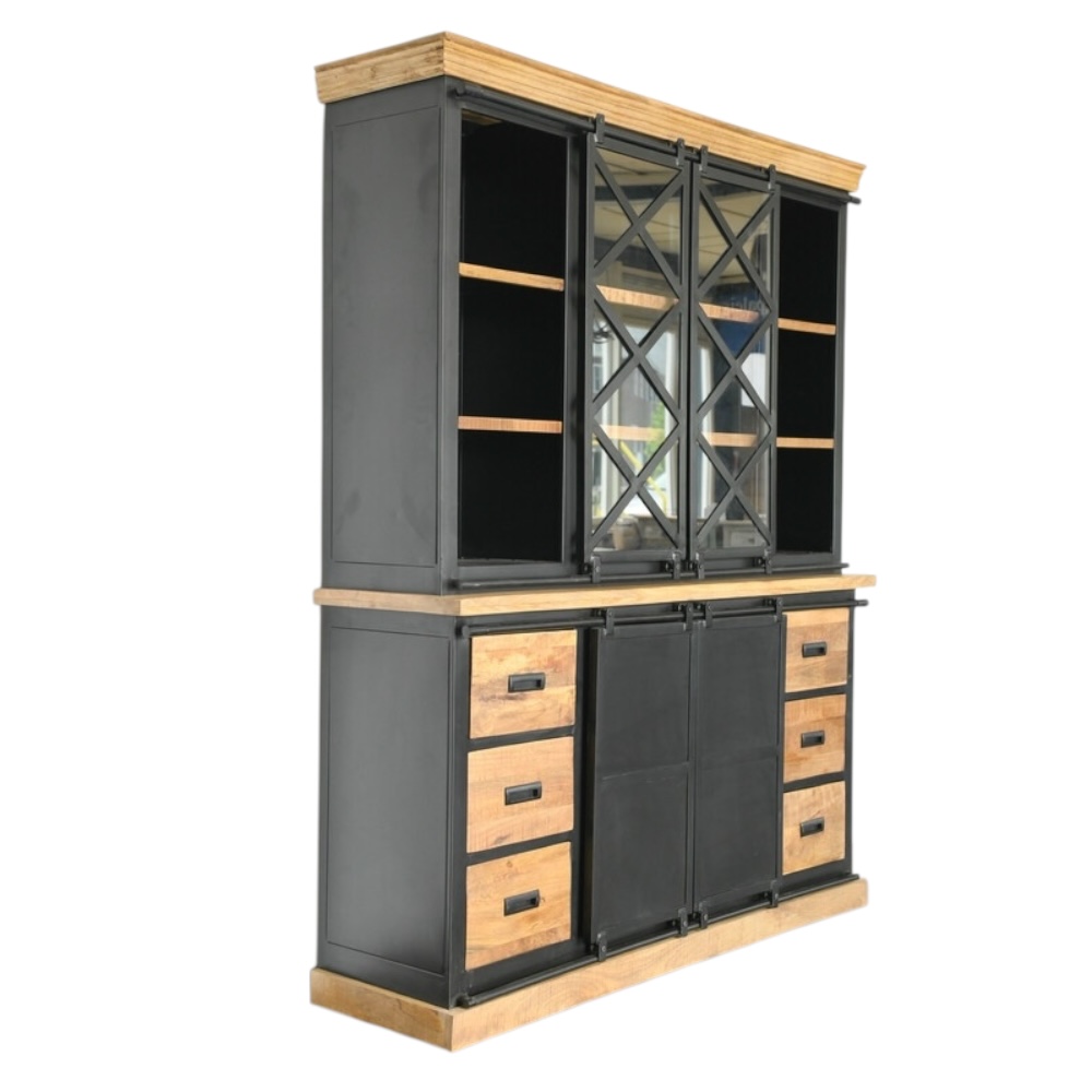 Dies ist ein einzigartiger Schrank, der komplett aus kolonialem Hartholz gebaut ist, mit Schubladen und schönen schwarzen Metallschiebeelementen, die diesem Schrank