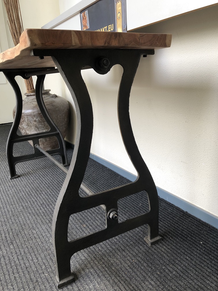 Dies ist ein außergewöhnliches Stück, ein Baumstamm Tischplatte aus Kolonialholz, voll von Massivholz, schönes Stück, siehe die Bilder. ABER schauen Sie sich diese Basis ist aus schwerem Gusseisen und Schmiedeeisen Konstruktion gemacht,