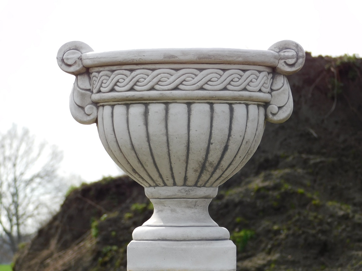 Elk detail is zorgvuldig vormgegeven, van de vloeiende lijnen tot de textuur van het steen, waardoor deze pot een tijdloze schoonheid uitstraalt die perfect past bij elke decoratiestijl.
