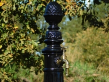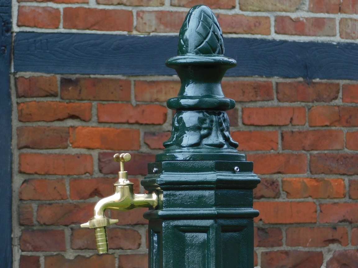 Klassischer, stehender Wasserhahn aus Aluminium in Dunkelgrün mit einem Wasserhahn aus Messing.